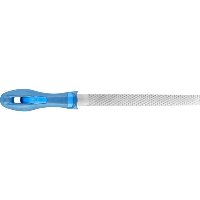 Halfronde, spits toelopende vijl met raspkap aan twee zijden. Vorm C volgens DIN 7263. Uitvoering met arend.