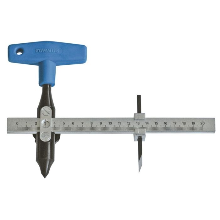 Rail met millimeteraanduiding. Kunststof greep, messen van geslepen gereedschapstaal.